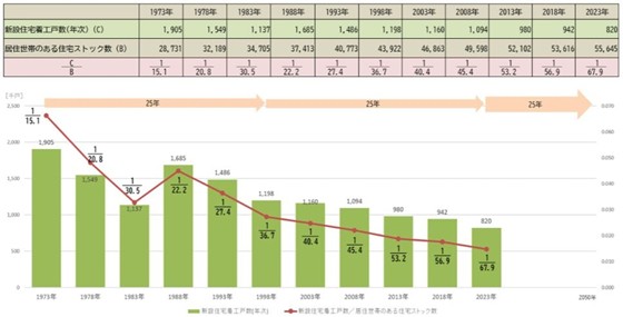高度経済成長期の1973年には、既存住宅の15軒に1軒の割合で新築が生まれていた。街のあちこちで槌音が響き、都市が新陳代謝を繰り返していた時代である。しかし、50年後の2023年には、その頻度は約1/70にまで低下している。もはや「新築が次々と建つ」こと自体が、当たり前の風景ではなくなりつつあるのだ。